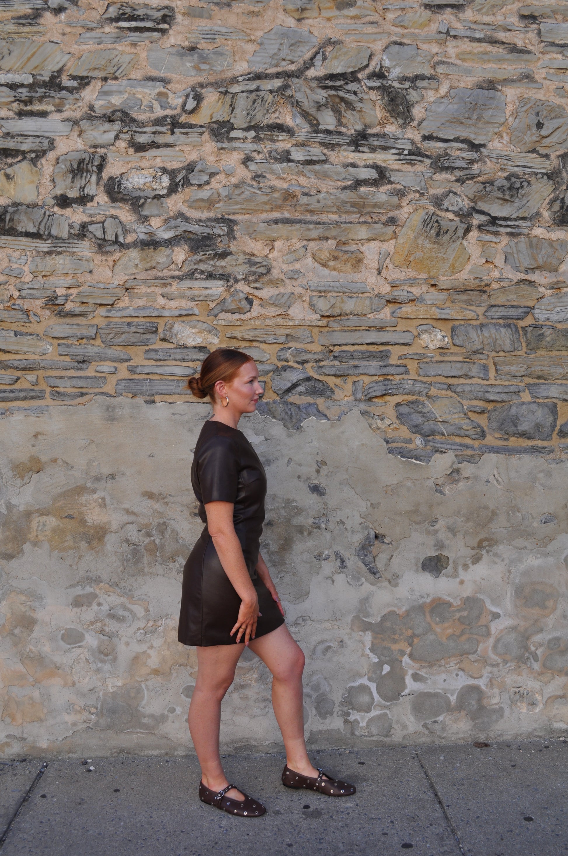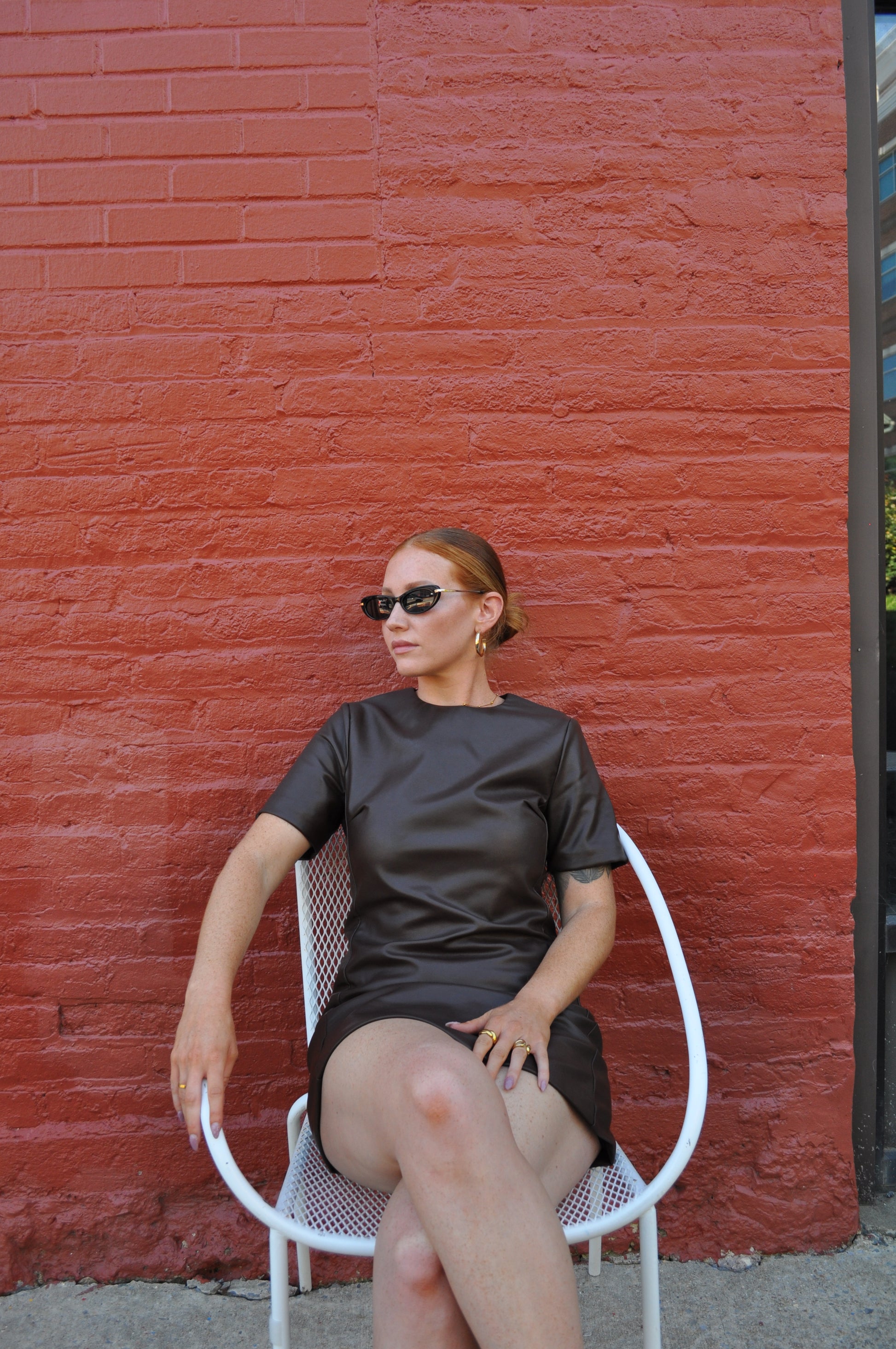 The Autumn dress is a fitted mini crafted from smooth faux leather and fully lined for comfort. Featuring a crew neckline, short sleeves, and a partial zipper closure at the center back, it delivers a sleek, modern silhouette.