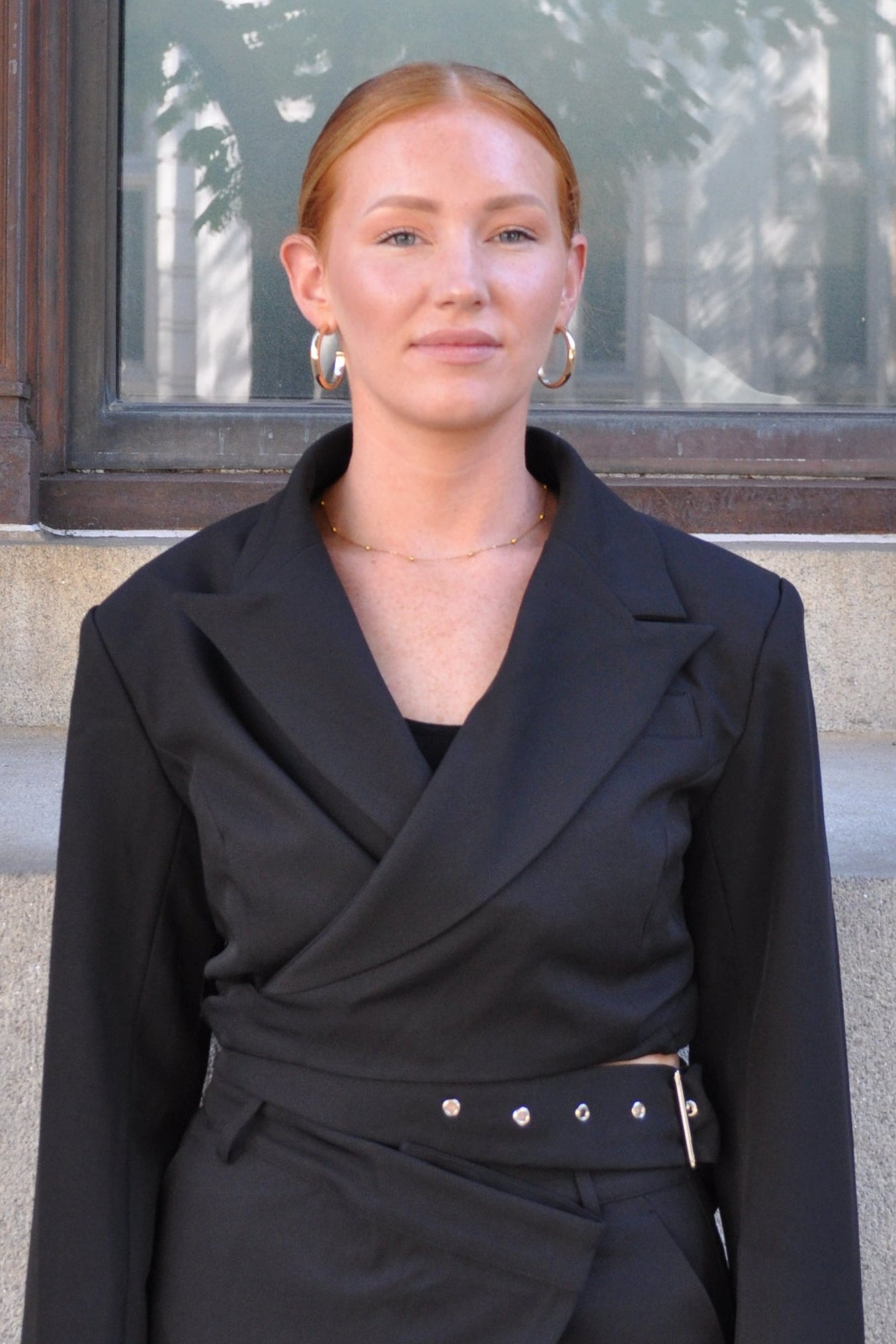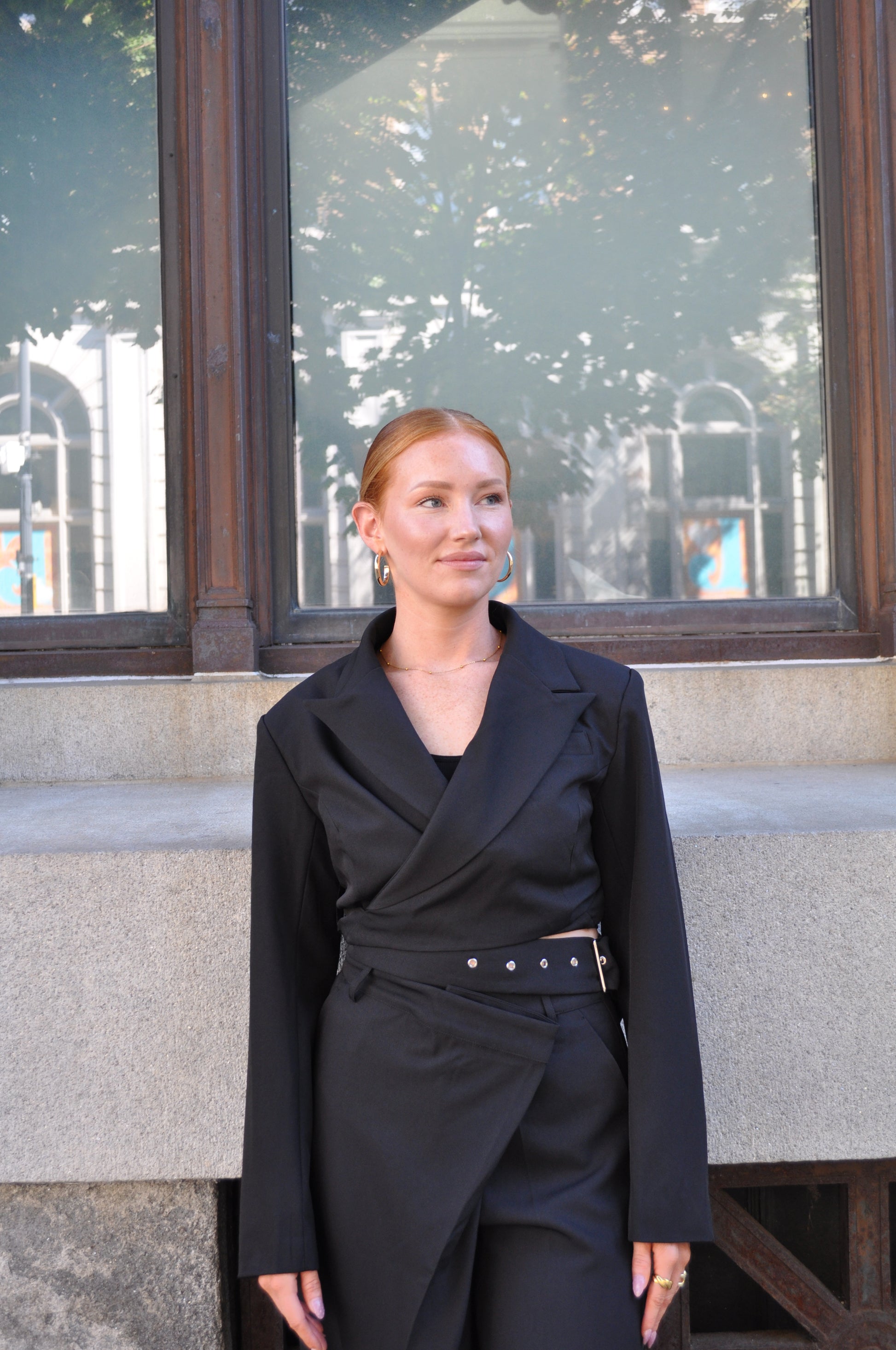 In some pictures shown, a black tank top was worn under the Black Cropped Open Back Blazer.